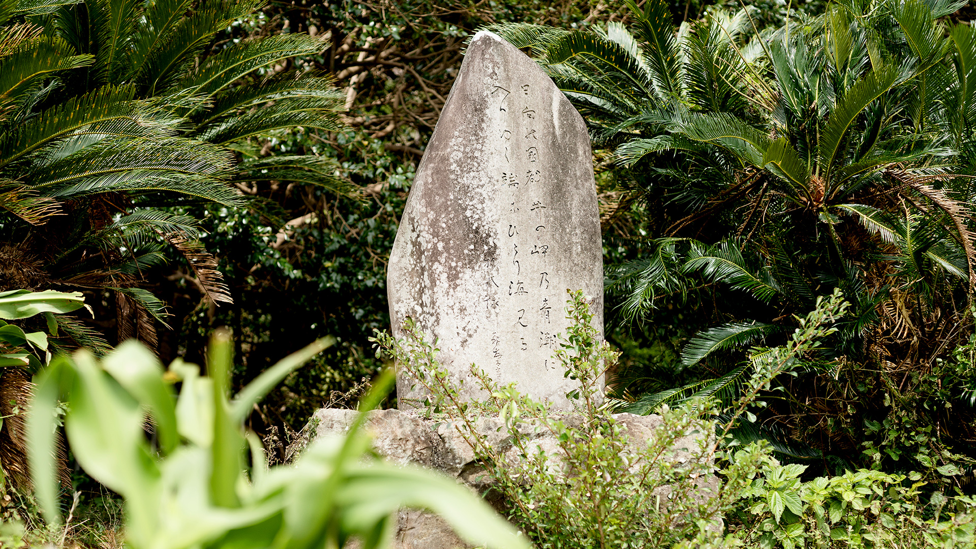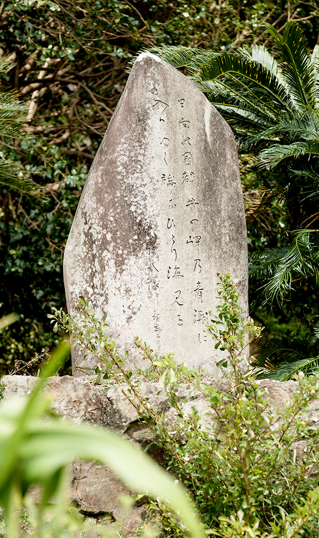 「日向の国 都井の岬の青潮に 入りゆく端に ひとり海みる」 0987-72-0479(串間市観光物産協会) 串間市大納(都井岬内) This monument is engraved with the poem, “Watching the ocean alone/ As the blue tide comes in at Cape Toi/ Hyuga-no-kuni.” Ono,Kushima-shi