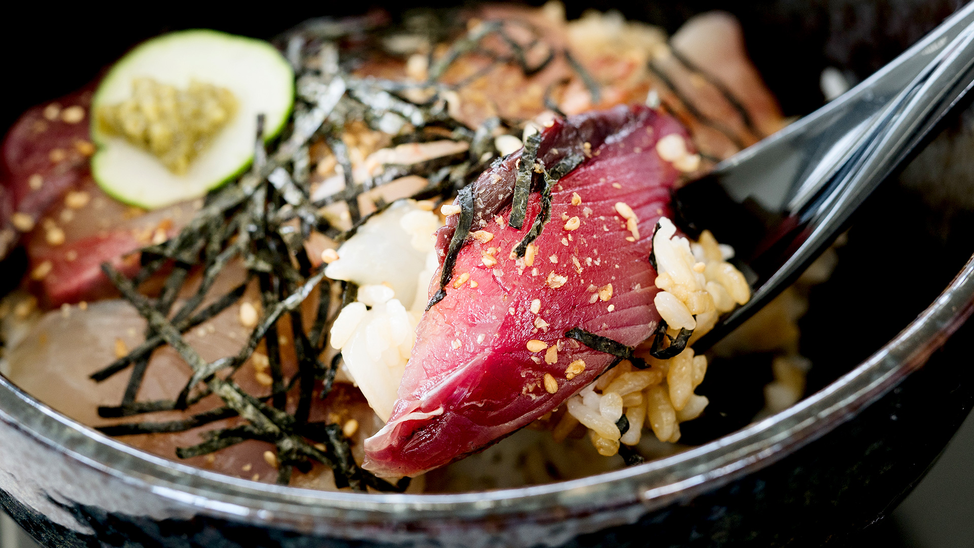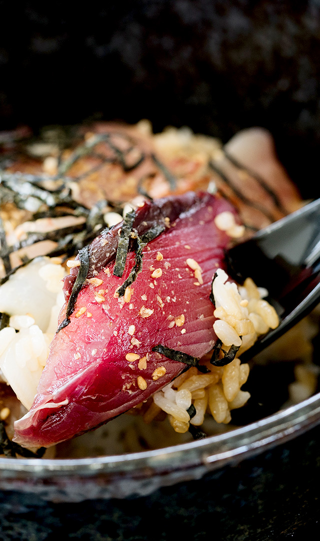Enjoy this bowl of rice topped with the day’s catch, a famous menu item at Kaiyoso.