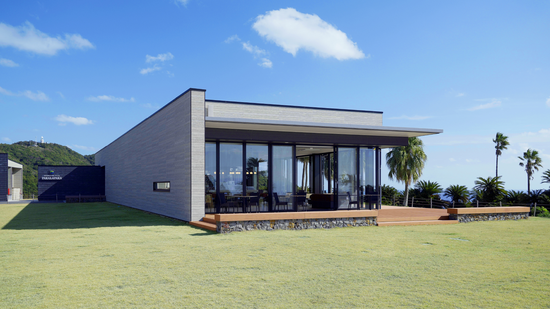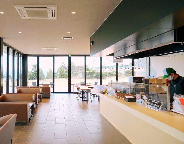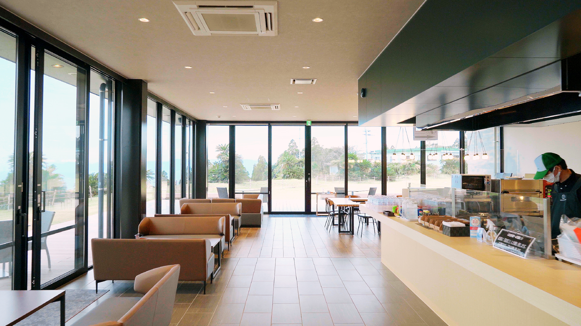 馬の足音にちなんだ愛称がつけられた休憩施設。席から見えるのは、どこまでも広がる青い海と、見渡す限り続く緑の丘。旅の途中で、極上のリラックスタイムを過ごそう。