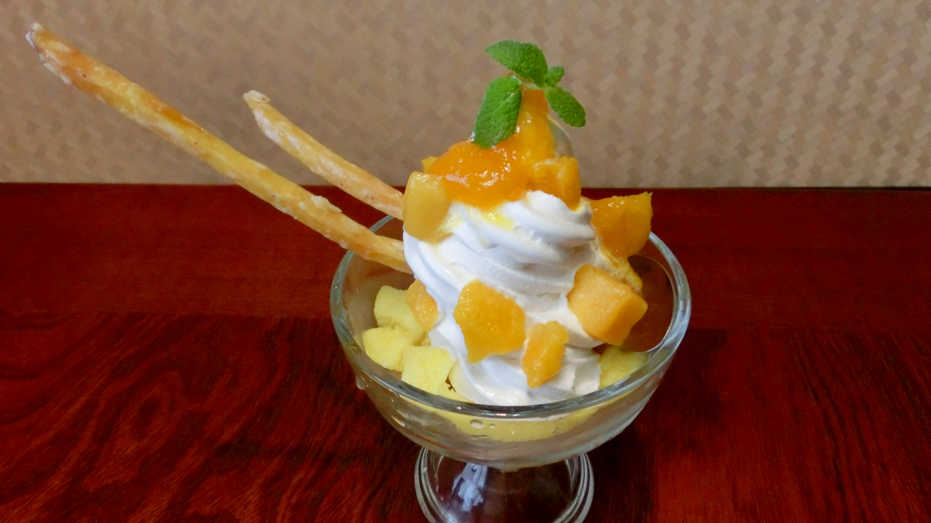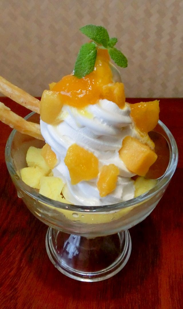 Treat yourself to a dessert that incorporates all of Kushima’s specialties. With ingredients like mango slices, sweet potato karinto, akumaki (a local delicacy), it’s a new concept in sweet.